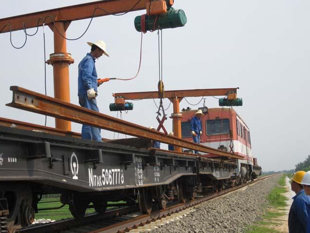 目前懸臂吊的使用領域不僅僅局限于工廠車間內,在室外露天環(huán)境中也會經??吹剿纳碛埃绕涫窃谝恍┐蠊こ痰慕ㄔO中,例如高鐵的建設,懸臂吊就經常對高鐵的無渣軌道等一系列的鋼鐵設備進行吊裝。